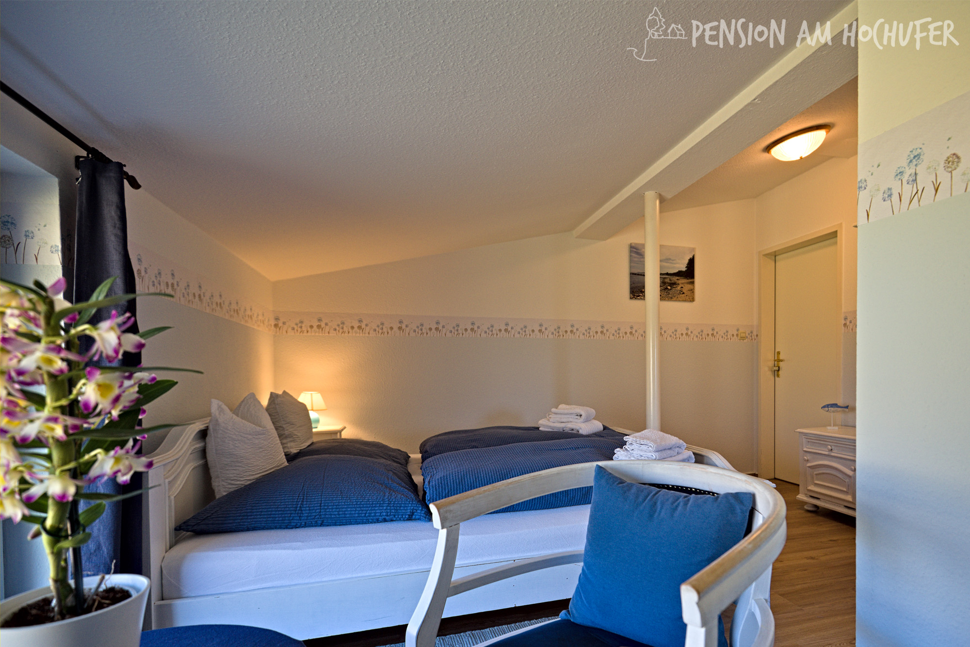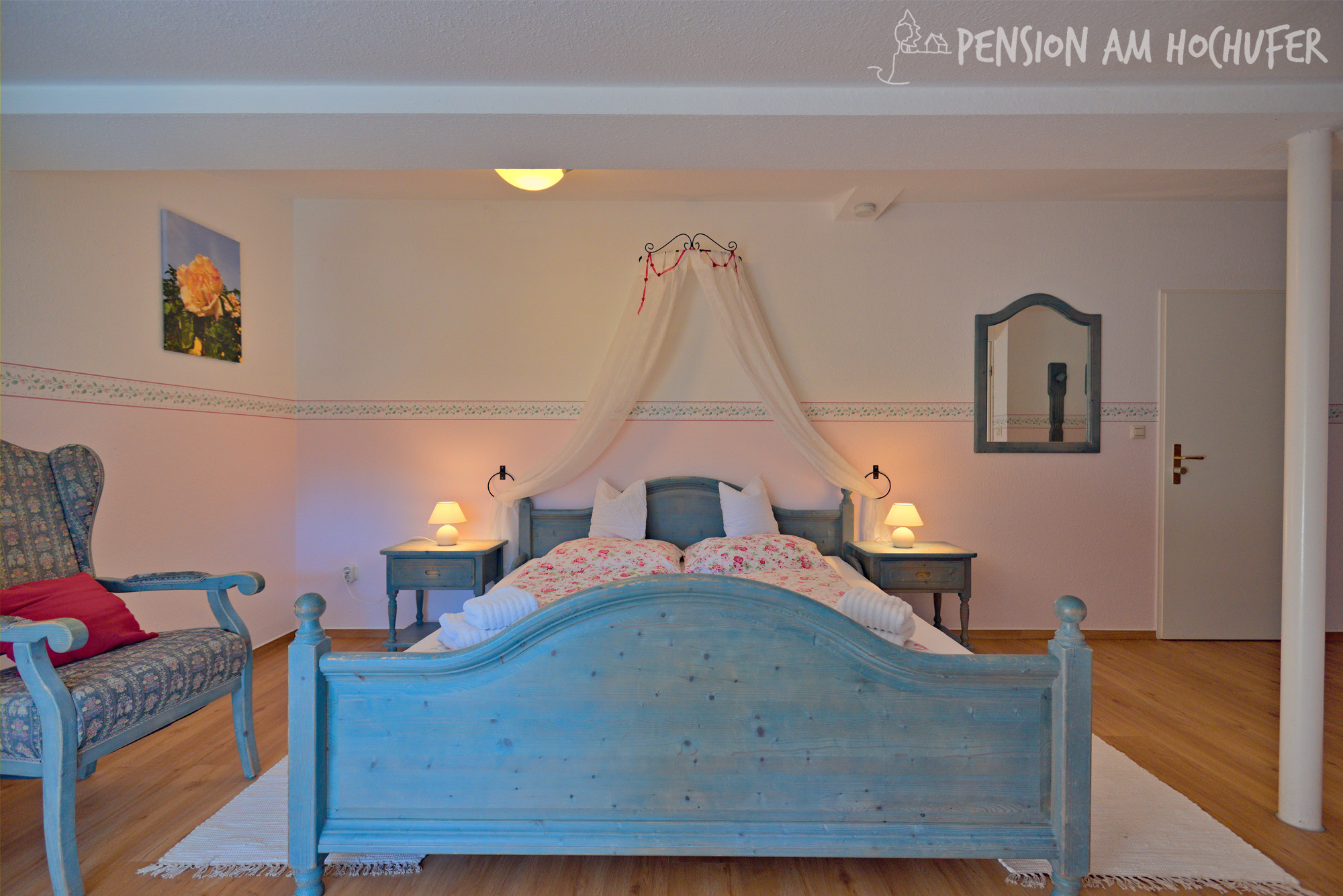 Der Himmel auf Rügen – romantisch, verspielt ohne Kitsch – für kuschelige Zweisamkeit unterm Dach. Von hier haben Sie einen herrlichen Blick auf die Pflaumenbäume in unserem Garten.